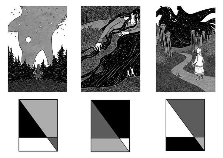 3-Value or Multi-Value Notan: Incorporates shades of grey in addition to black and white, allowing for more nuanced compositions.