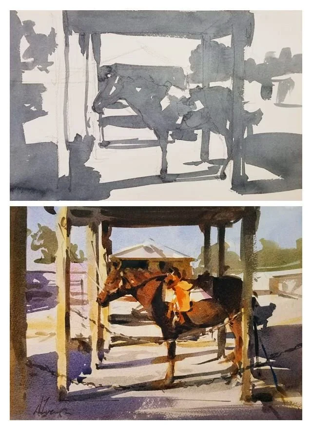 Objective: Understand how light and dark shapes interact in a real-world scene. This exercise helps students simplify complex scenes and plan compositions effectively.